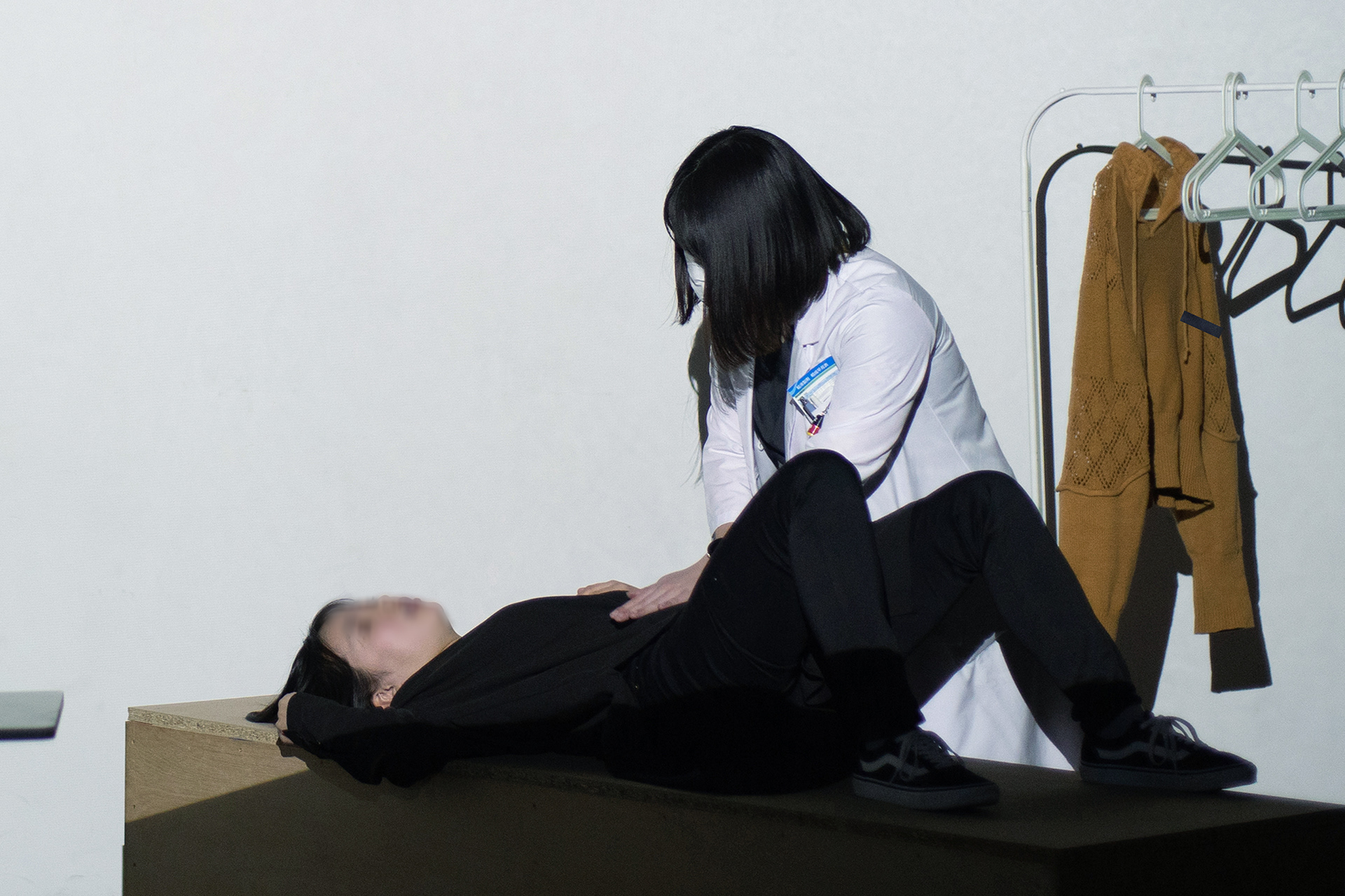 In this performance, I invite a woman working as a medical resident to join me in tracing a condensed version of her day—from waking up to going to bed.